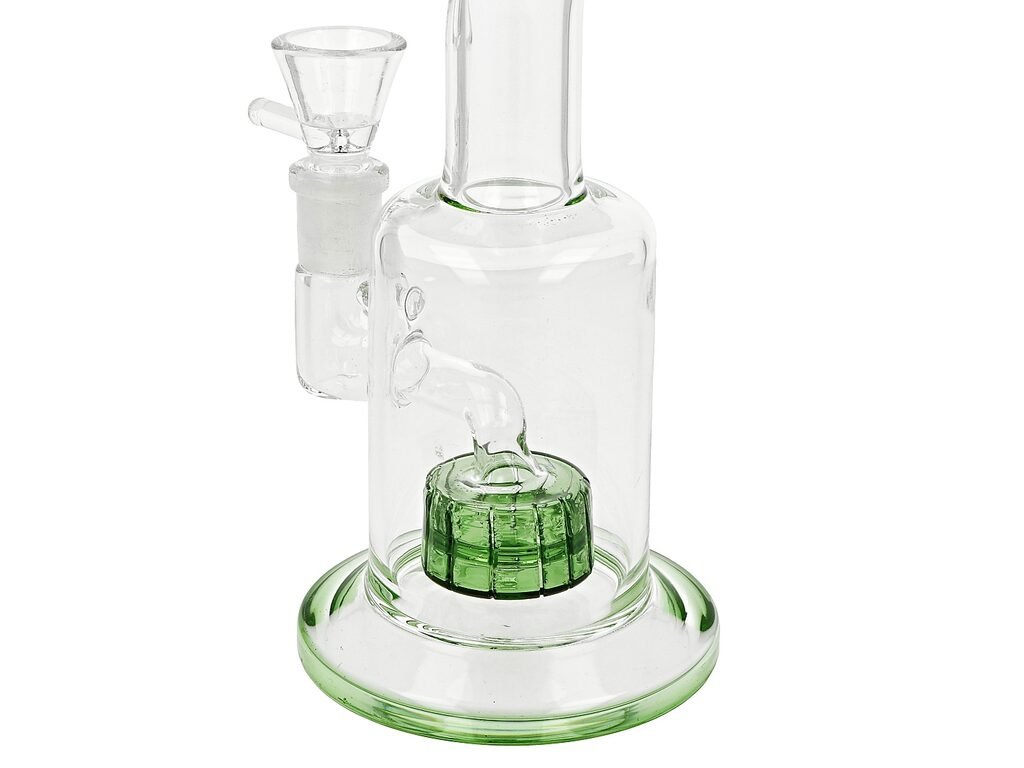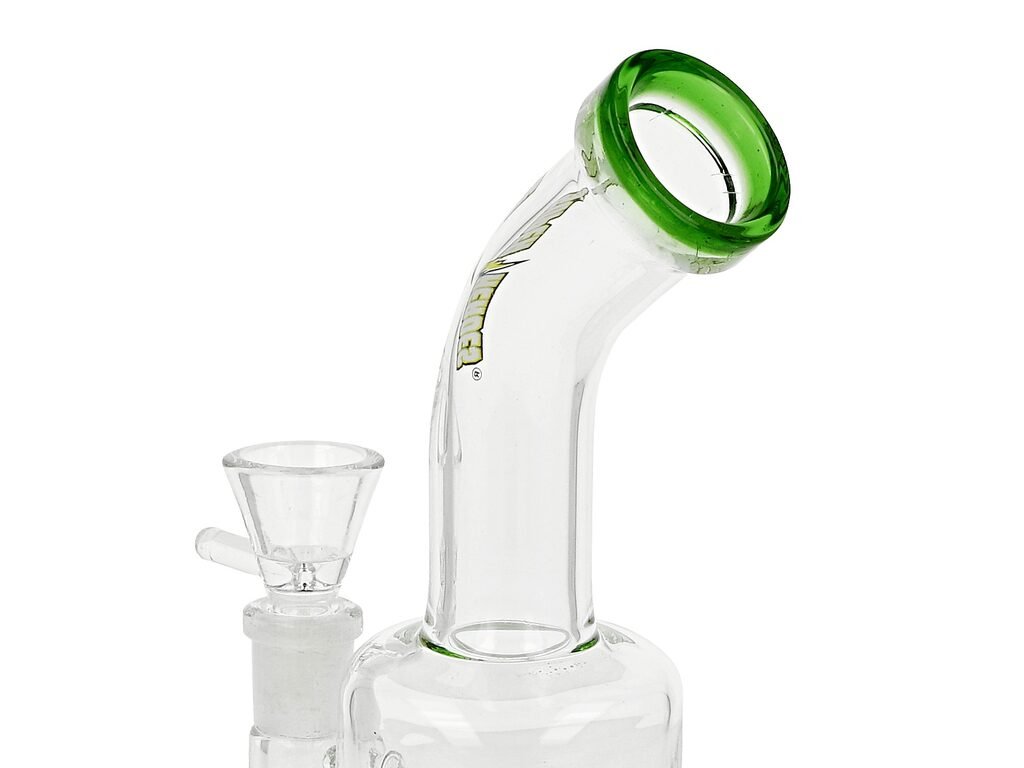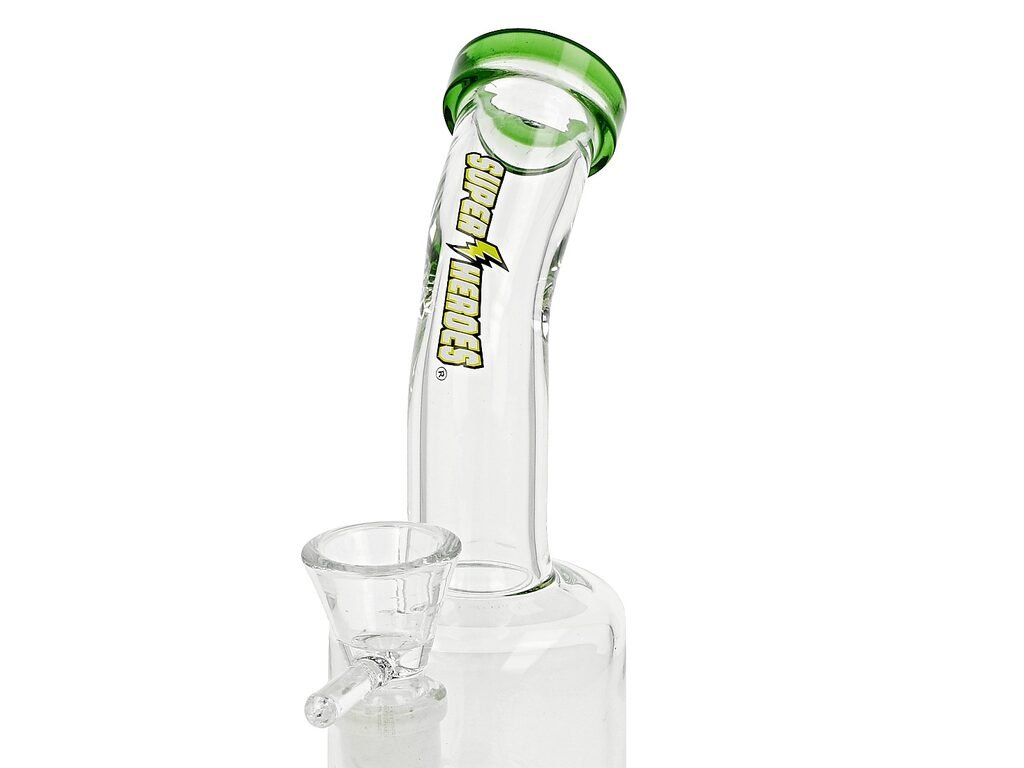 Skleněný bong s perkolací Super Heroes Green. Zahnutý bubbler v zeleném tónu je zdobený logem. Bong ukončeným středně velkým hrdlem je ve spodní části vybavený perkolací Matrix, která pomáhá kouř zjemnit a ochladit. Oproti standardním bongům je tento prémiový bong vyrobený z tepelně odolného borosilikátového skla tloušťky 3 mm. Vestavěný chillum bongu je ukončený kotlíkem s praktickým držátkem a otvorem 4 mm.