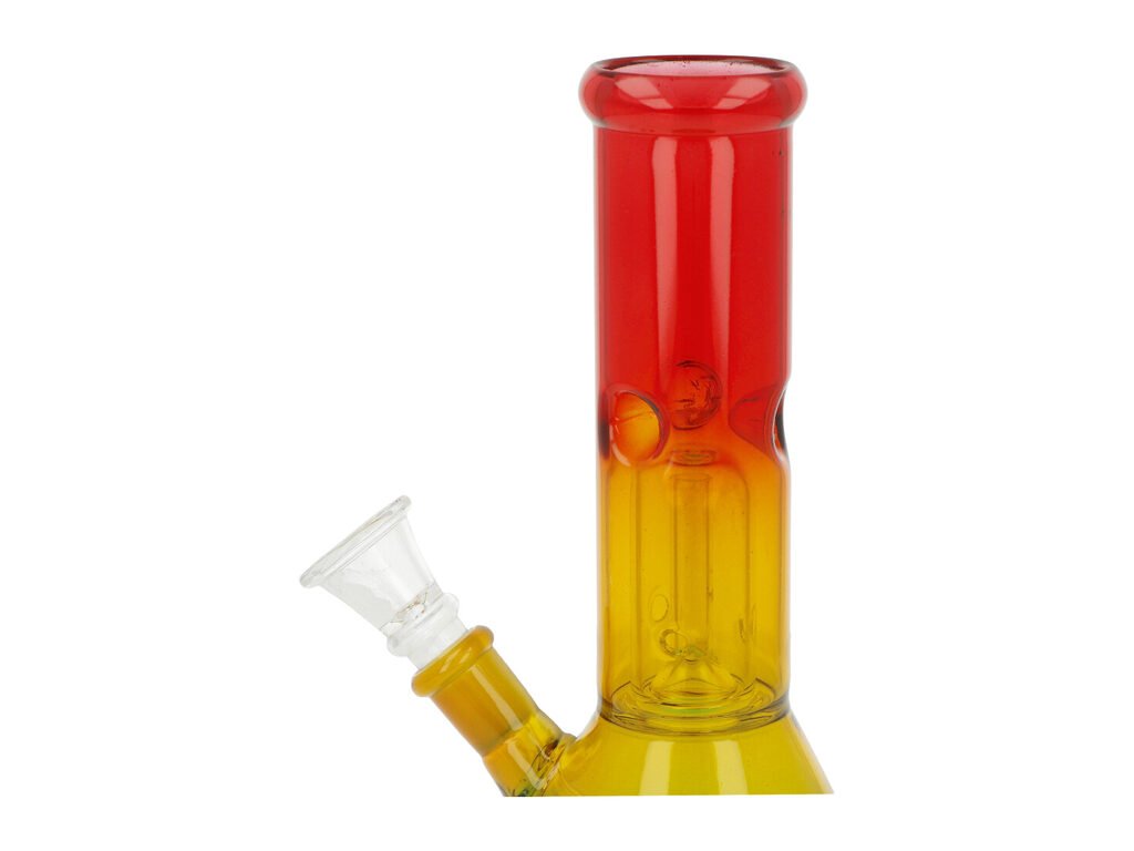 Menší skleněný bong s perkolací Super Heroes RYG Ice. Transparentní bong tvaru laboratorní kádinky v trojbarevném provedení je ukončený středně velkým hrdlem. Ice bong je vybavený "výstupky" pro udržení kostek ledu k ochlazení kouře a perkolací typu Dome, která kouř zjemňuje. Oproti standardním bongům je tento prémiový bong vyrobený z tepelně odolného borosilikátového skla tloušťky 2 mm. Jednodílný chillum bongu je ukončený nalisovaným kotlíkem s otvorem cca 5 mm.