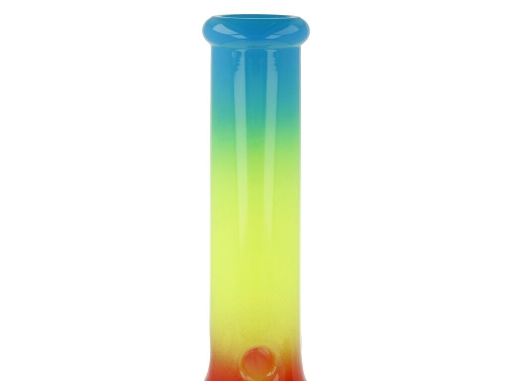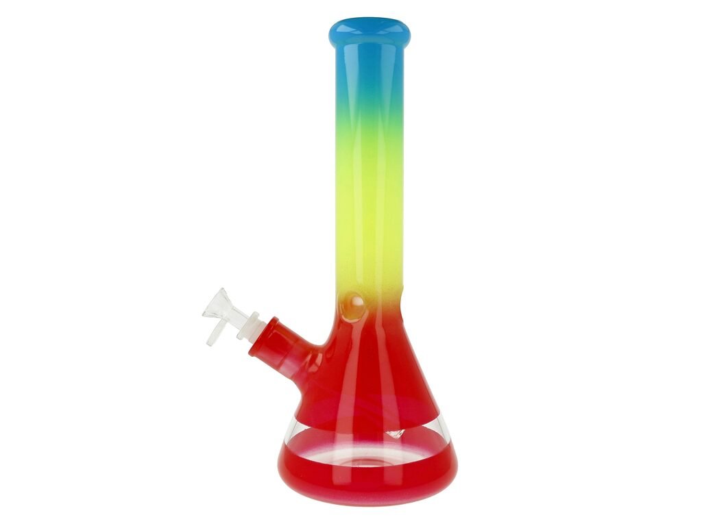 Skleněný bong Super Heroes Colors. Bong tvaru Beaker je v atraktivním trojbarevném provedení s lesklým povrchem. Ice bong ukončený silným hrdlem je vybavený "výstupky" pro udržení kostek ledu k ochlazení kouře. Oproti standardním bongům je tento prémiový bong vyrobený z tepelně odolného borosilikátového skla tloušťky 7 mm. Ve spodní části najdeme otvor pro turbo s gumovou záslepkou. Dvoudílný chillum bongu s difuzérem se šesti zářezy, který pomáhá zjemnit a ochladit kouř již na začátku, je ukončený samostatným kotlíkem s praktickým držátkem a větším otvorem (cca 7 mm).