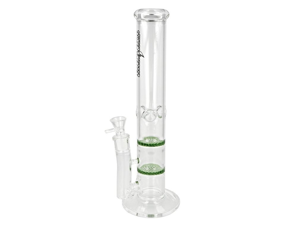 Skleněný bong s dvojitou perkolací Super Heroes Ice Green. Rovný transparentní bong v zeleném tónu je na čelní straně zdobený logem Super Heroes a je ukončeným silným hrdlem. Ice bong je vybavený "výstupky" pro udržení kostek ledu k ochlazení kouře a dvěma perkolacemi typu Honeycomb které kouř dokonale rozdělí, zjemní a tím ještě více ochladí. Dobrou stabilitu bongu zajišťuje 10 mm silná kulatá základna. Oproti standardním bongům je tento prémiový bong vyrobený z tepelně odolného borosilikátového skla tloušťky 5 mm. Vestavěný chillum je ukončený samostatným kotlíkem s praktickým držátkem.