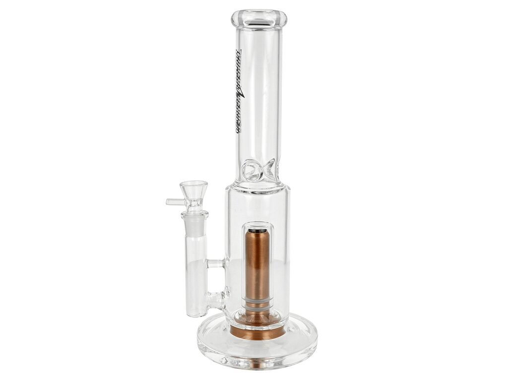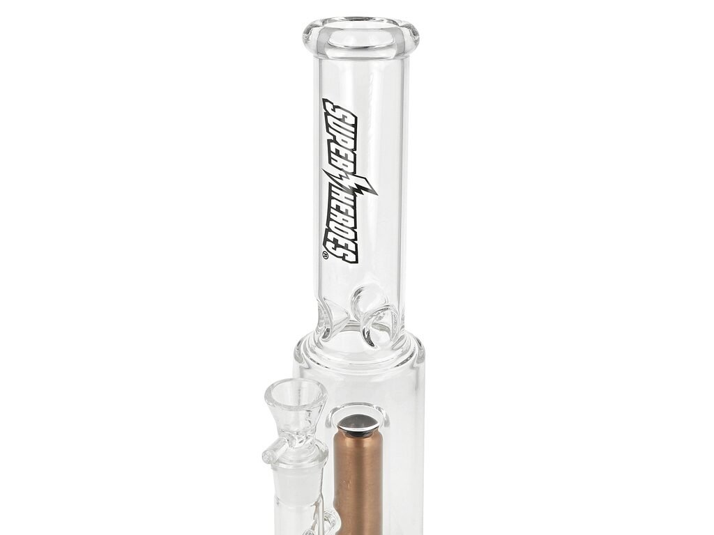 Rovný bong Super Heroes Transparent Ice. Transparentní bong je na čelní straně zdobený logem Super Heroes. Ice bong ukončený silným hrdlem je vybavený "výstupky" pro udržení kostek ledu k ochlazení kouře. Kruhová základna o tloušťce 13 mm zajišťuje bongu skvělou stabilitu. Oproti standardním bongům je tento prémiový bong vyrobený z tepelně odolného borosilikátového skla tloušťky 4,5 mm. Vestavěný chillum bongu je ukončený samostatným kotlíkem s praktickým držátkem a menším otvorem cca 5 mm.