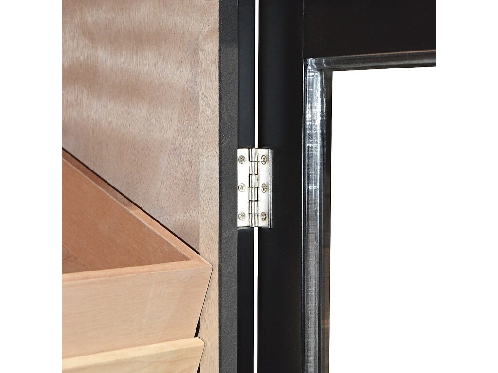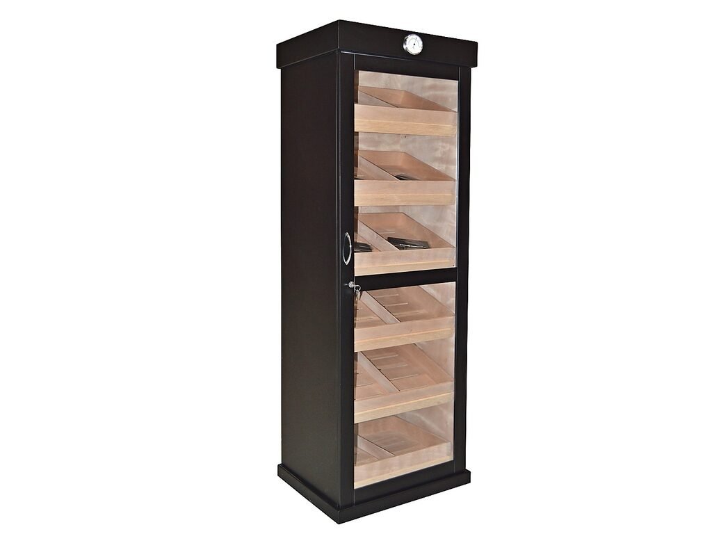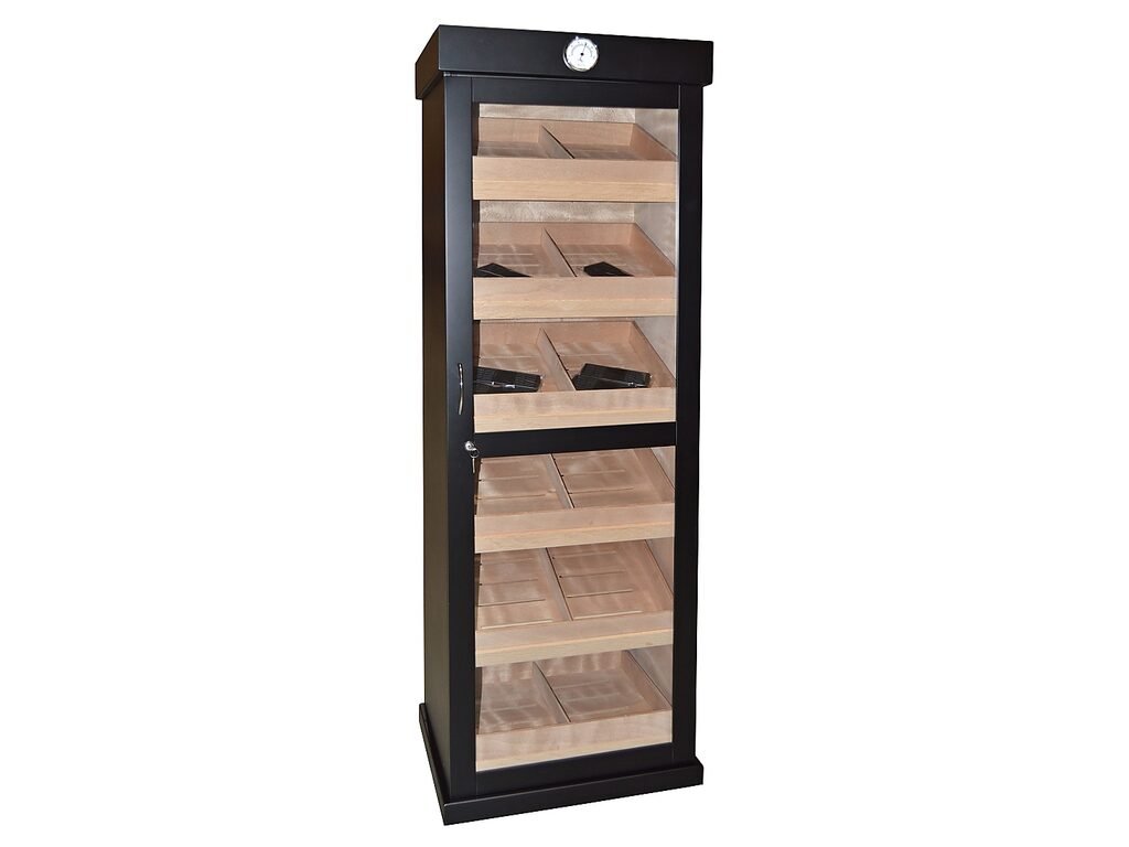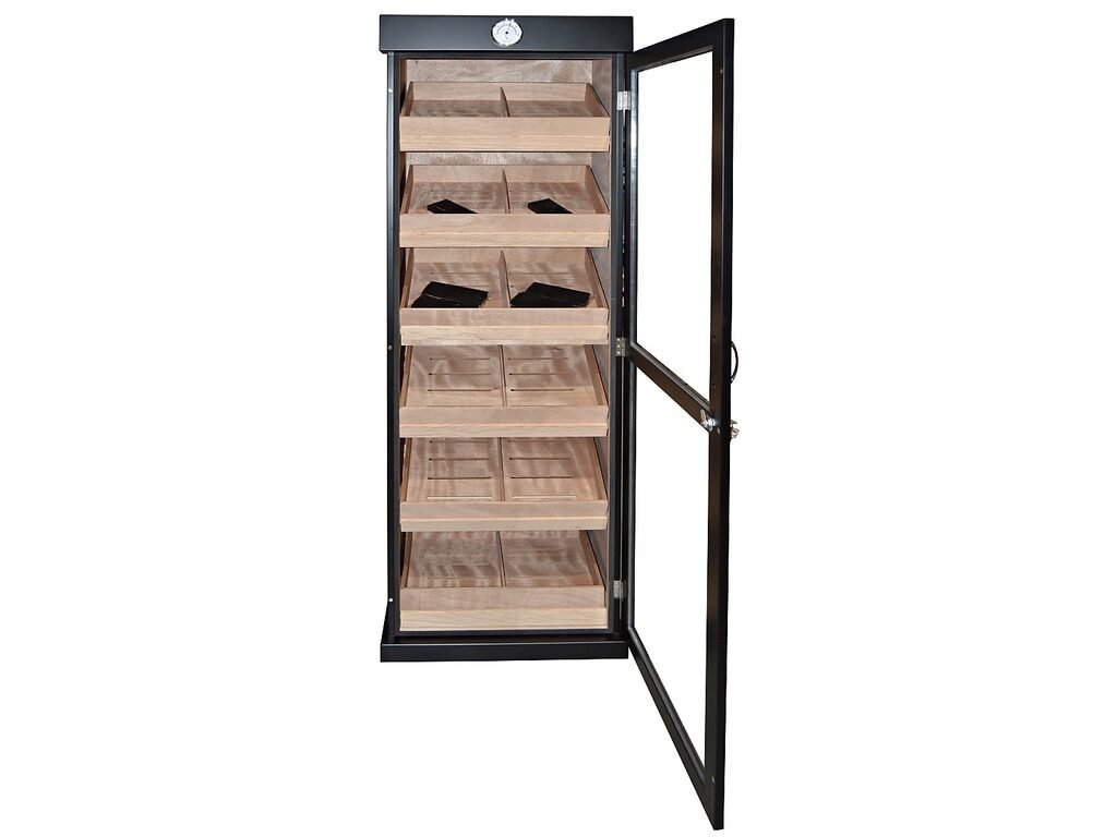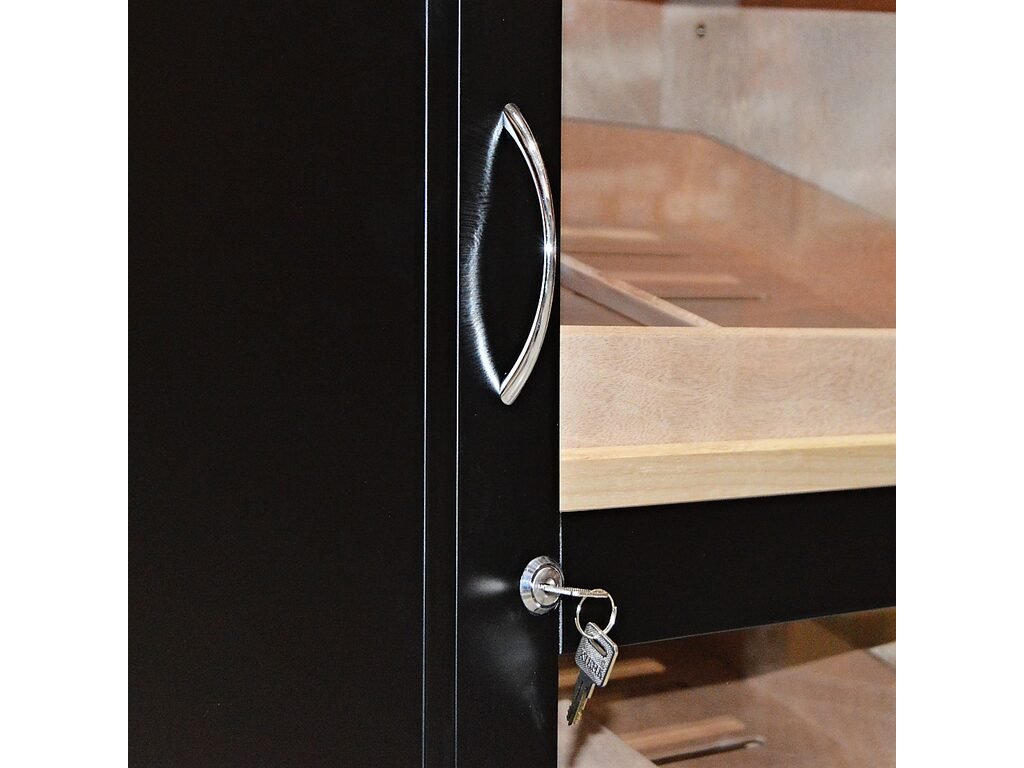 Skříňový humidor na doutníky Black s kapacitou cca 500 - 600 doutníků (v závislosti na velikosti). Uzamykatelný humidor s vestavěným zámkem a prosklenými dveřmi je v černém polomatném provedení. Dveře s chromovým madlem jsou zavěšené na kvalitních pantech a jsou vyplněné čirým akrylem.