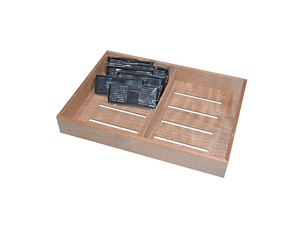 Balení obsahuje: humidor, 6x cedrový foch a přihrádka, 6x přepážka, 1x vestavěný vlhkoměr, 6x polymerový zvlhčovač, 2x klíč, kovové šroubovací kolíky pro instalaci fochů