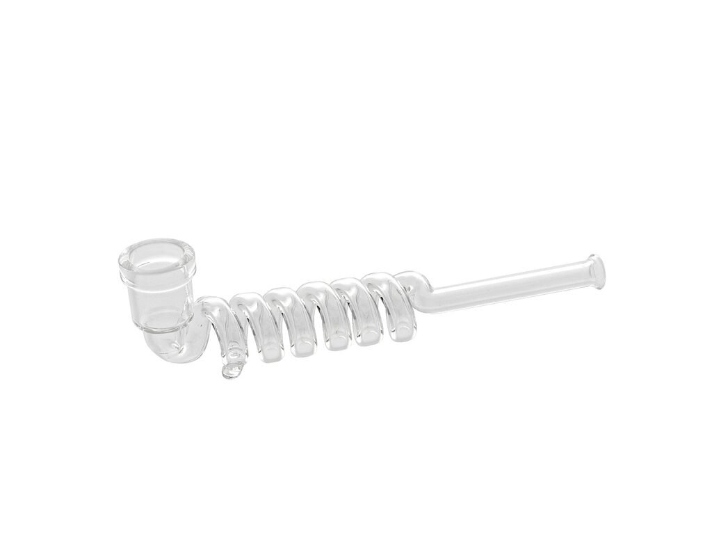 Šlukovka Spiral Transparent. Čirá skleněná dýmka se spirálou je vyrobená z kvalitního borosilikátového skla tloušťky 1,5 mm. Spirála pomáhá ochlazovat kouř, díky jeho pomalejšímu průchodu skrze ni. Na spodní straně šlukovky najdeme dvě nožičky, o které ji můžeme opřít, když ji nepoužíváme.