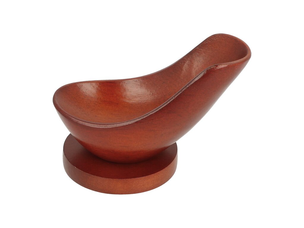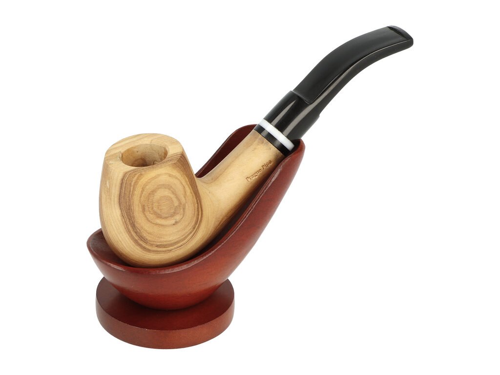 Dřevěný stojánek na jednu dýmku. Praktický stojánek na dýmku ve tvaru křesílka je ve tmavší hnědo červené barvě s pololesklým povrchem. Na spodní straně kulaté základny stojánku najdeme plstěné podložky, které zajišťují jeho stabilitu a současně zabraňují poškrábání povrchu. Zobrazená dýmka není součástí dodávky. Stojánek je dodávaný v kartonové krabičce.