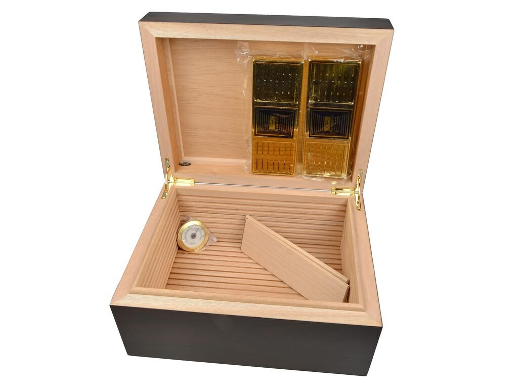 Součástí balení humidoru je analogový vlhkoměr a dva polymerové zvlhčovače včetně oboustranné samolepky a magnetem pro uchycení. Vnitřek humidoru je vyroben z kvalitní silné dýhy a je vyložený cedrovým dřevem.