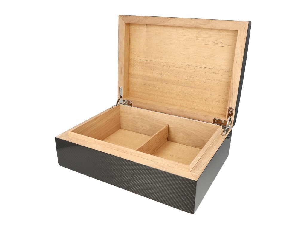 Stolní humidor na doutníky Angelo Real Carbon s kapacitou cca 40 - 50 doutníků (v závislosti na velikosti). Atraktivní humidor v černém karbonovém provedení má povrch ve vysokém lesku. Humidor je vyrobený z pravé dýhy, která je potažená karbonovou vrstvou. Humidor je dodávaný bez zvlhčovače a vlhkoměru. Pohodlné zavírání víka zajišťují kvalitní kovové panty. Prostor pro doutníky lze rozdělit dle potřeby přiloženou přepážkou. Vnitřek humidoru je vyložený cedrovým dřevem, které prospívá skladování doutníků. Na spodní straně humidoru najdete sokl s jemnou sametovou látkou, na který se humidor položí. Látka zabrání poškození povrchu, na který je humidor umístěný.