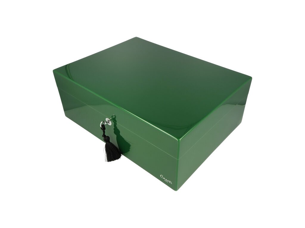 Atraktivní humidor na doutníky s kapacitou cca 60 - 70 doutníků (v závislosti na velikosti). Uzamykatelný humidor Caseti Paris ve tmavě zelené barvě má povrch ve vysokém lesku. Vnitřek precizně zpracovaného humidor je vyrobený z cedrového dřeva, které prospívá skladování doutníků. Prostor pro doutníky je možné rozdělit dle potřeby přiloženou cedrovou přepážkou. Pohodlné zavírání víka zajišťují kvalitní kovové panty. Stolní humidor je vybavený výměnným analogovým vlhkoměrem a polymerovým zvlhčovačem. Oba se uchytí pomocí magnetu na vnitřní stranu víka. Poškrábání povrchu, na kterém je humidor položený, zabraňuje jemná sametová látka na spodní části. Humidor Caseti je dodávaný zabalený v jemné tkanině a originální krabici.