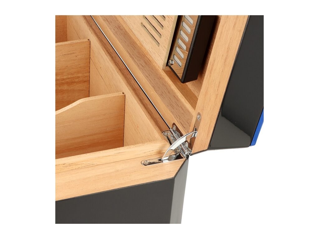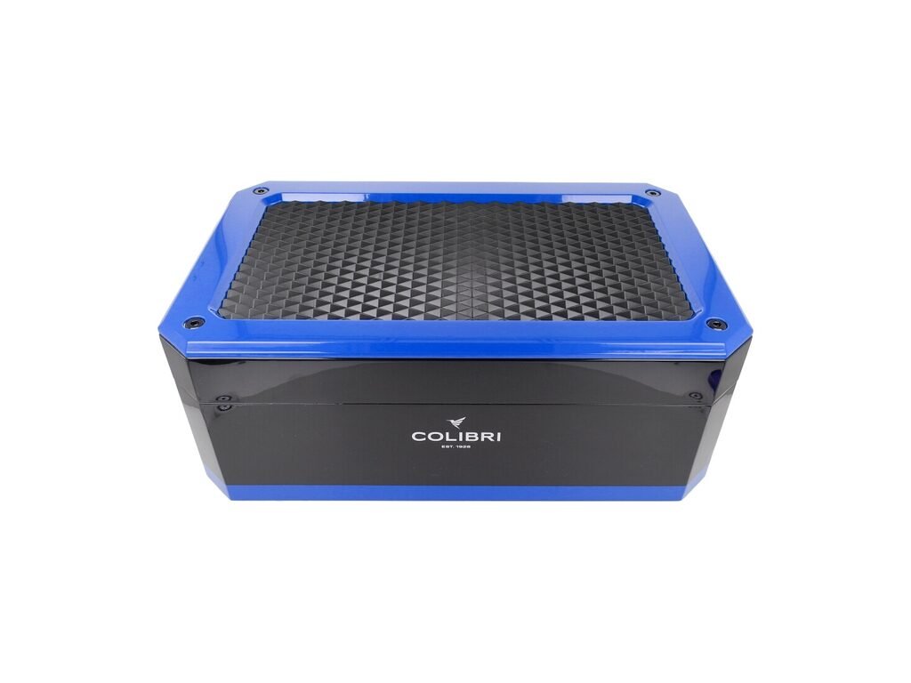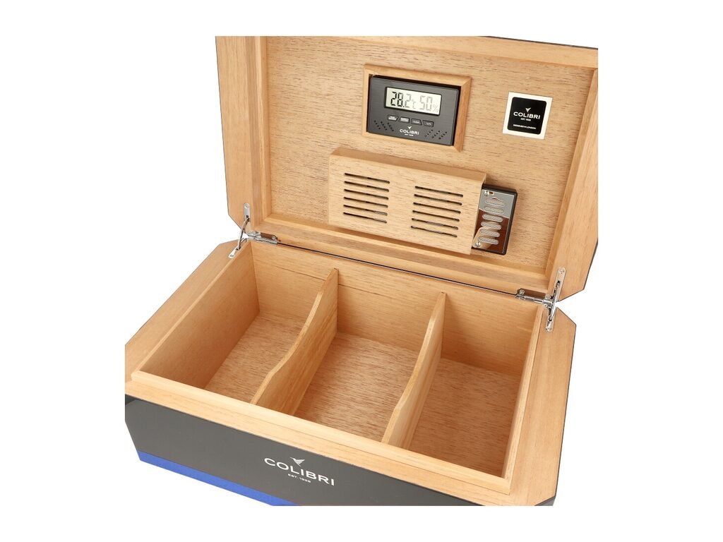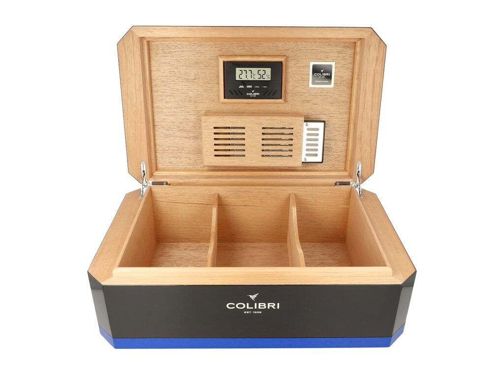 Atraktivní humidor na doutníky s kapacitou cca 80 - 100 doutníků (v závislosti na velikosti). Humidor Colibri v moderním designu v černo modré kombinaci má povrch ve vysokém lesku. Vnitřek precizně zpracovaného humidor je vyrobený z cedrového dřeva, které prospívá skladování doutníků. Prostor pro doutníky je možné rozdělit dle potřeby přiloženými cedrovými přepážkami. Pohodlné zavírání víka zajišťují kvalitní kovové panty. Stolní humidor je vybavený digitálním vlhkoměrem a zvlhčovačem s houbou. Vlhkoměr je uchycen pomocí magnetu. Zvlhčovač lze uchytit dvěma způsoby, a to zasunutím do připravené přihrádky pro zvlhčovač, která je připevněná magnetem nebo pomocí přiložené lepicí pásky se suchých zipem. Poškrábání povrchu, na kterém je humidor položený, zabraňuje jemná sametová látka na spodní části. Humidory Colibri jsou zabalené v jemné tkanině a dodávané v originální krabici.