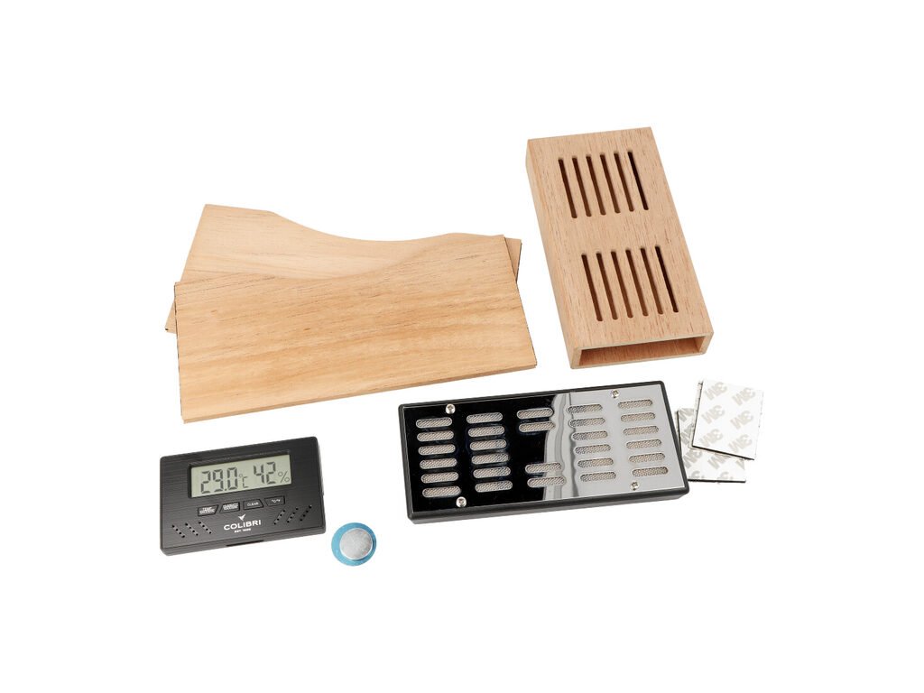 Obsah balení: humidor, 2x přepážka, 1x digitální vlhkoměr (s baterií), 1x zvlhčovač s houbou, 1x přihrádka na zvlhčovač, 2x lepicí pásek se suchým zipem, 1x magnet a plechová podložka (pro vlhkoměr)