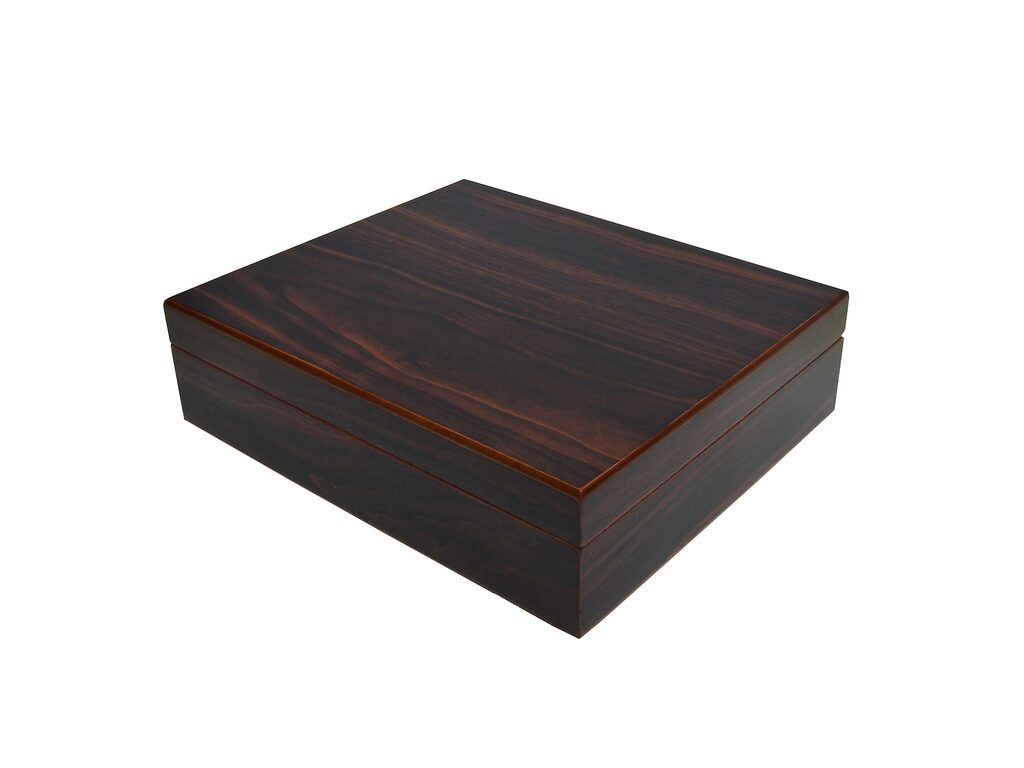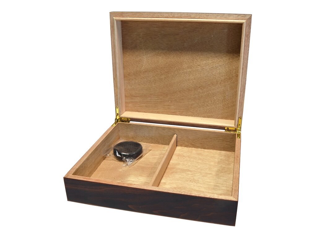 Stolní humidor na doutníky s kapacitou cca 20 doutníků. Vnitřek humidoru je vyložený cedrovým dřevem. Dodáván pouze se zvlhčovačem. Rozměr: 26x22x7 cm.