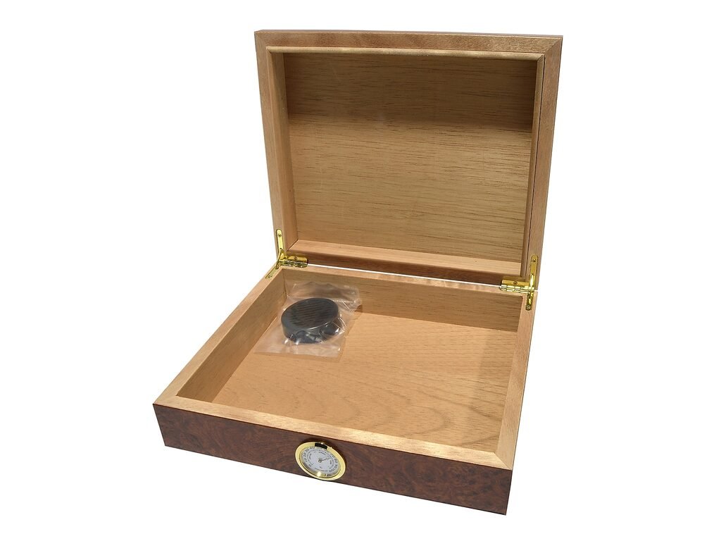 Stolní humidor na doutníky s kapacitou cca 20 doutníků. Dodáván s vlhkoměrem a zvlhčovačem. Vnitřek humidoru je vyložený cedrovým dřevem. Rozměr: 22x22x6,5 cm.