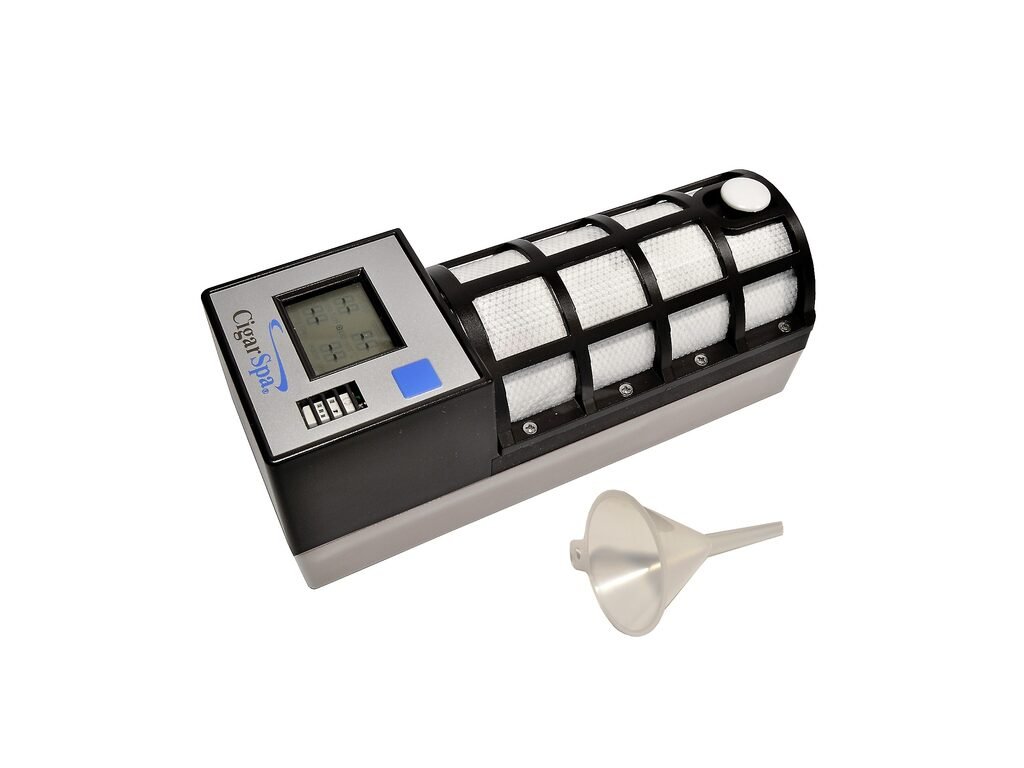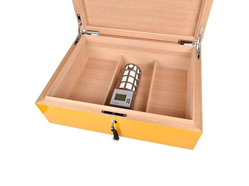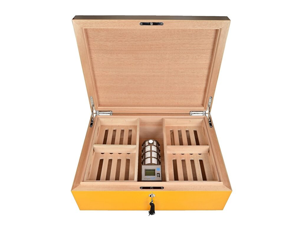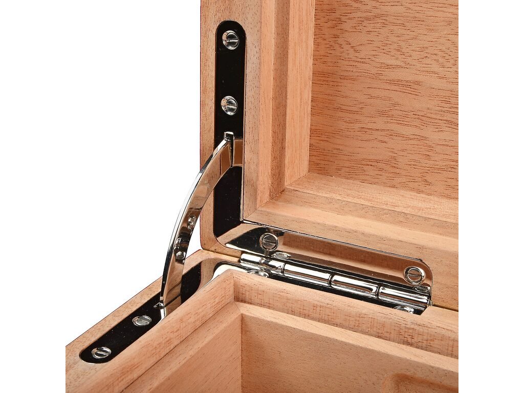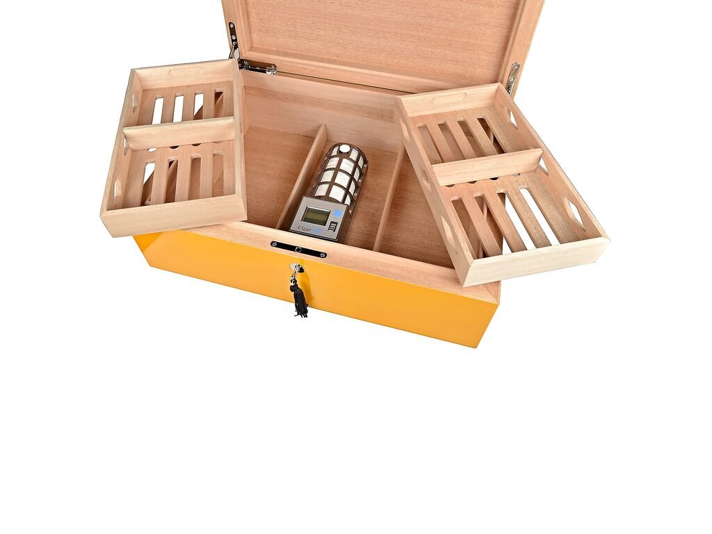 Stolní humidor na doutníky s kapacitou cca 80 doutníků. Dodáván s plně automatickým elektronickým zvlhčovačem s vlhkoměrem Cigar SPA. Vnitřek humidoru je vyložený cedrovým dřevem. Rozměr: 43x32x15 cm.