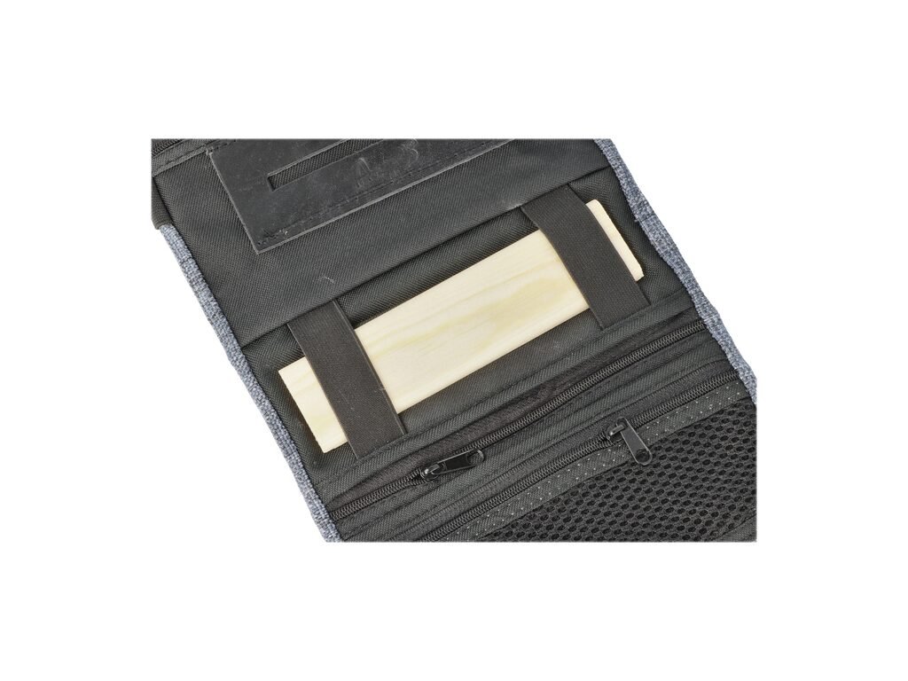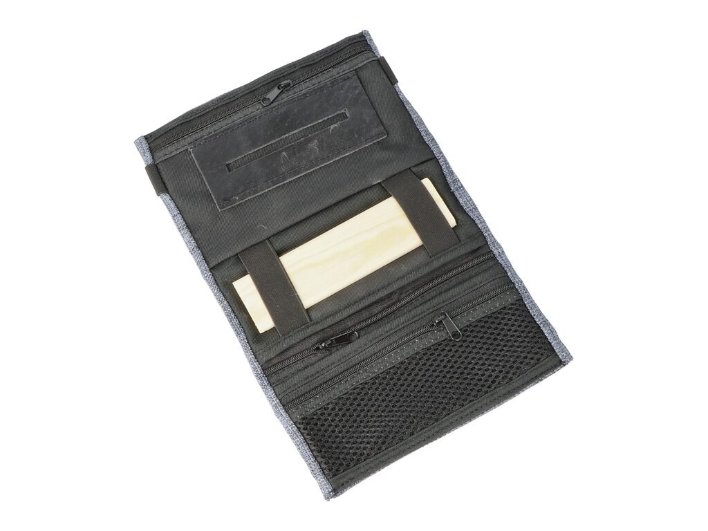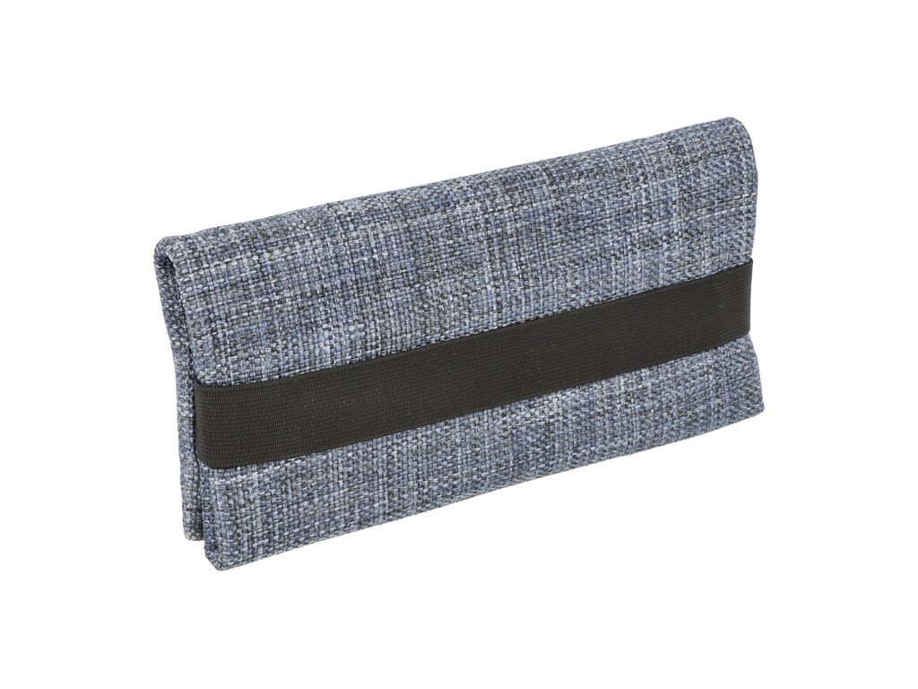 Pouzdro na tabák Angelo RYO s balicí podložkou. Látkové pouzdro na tabák a další kuřácké potřeby, které potřebujete při balení cigaret je vyrobené z pevné režné látky v modrém provedení. Po rozevření pouzdra najdeme hlavní kapsu na tabák, tři uzavíratelné kapsy na zip, kapsu na papírky a dřevěnou balicí podložku. Pro uzavření pouzdro přeložíte a přetáhnete gumou.