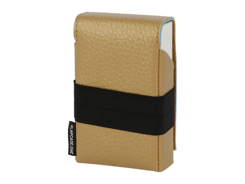 Kožené pouzdro na cigarety s gumou na zapalovač ručně vyrobené v Rakousku. Praktické pouzdro Flapcase na celou krabičku cigaret klasické velikosti King Size (80 mm) je vyrobené z kvalitní kůže. Pololesklý povrch pouzdra ve zlatém odstínu má jemnou texturu. Vypadnutí krabičky je zajištěno zapínáním pouzdra na magnet. Po celém obvodu pouzdra je guma, za kterou můžeme vložit zapalovač. Pouzdro je dodávané v dárkové plastovém sáčku.