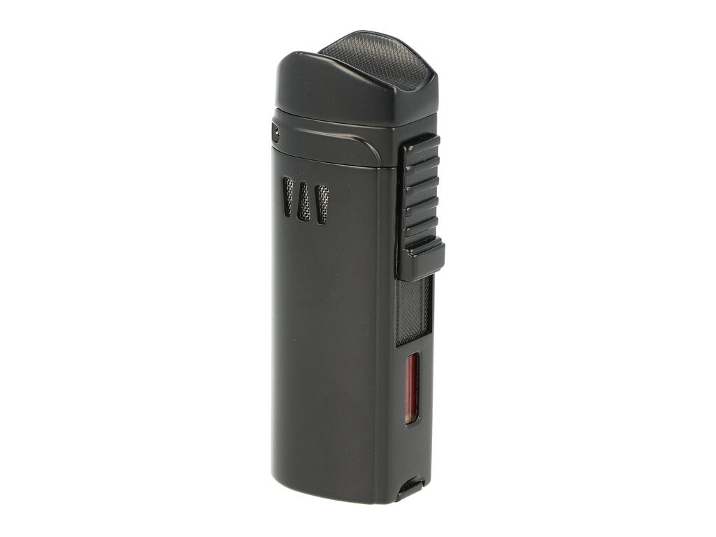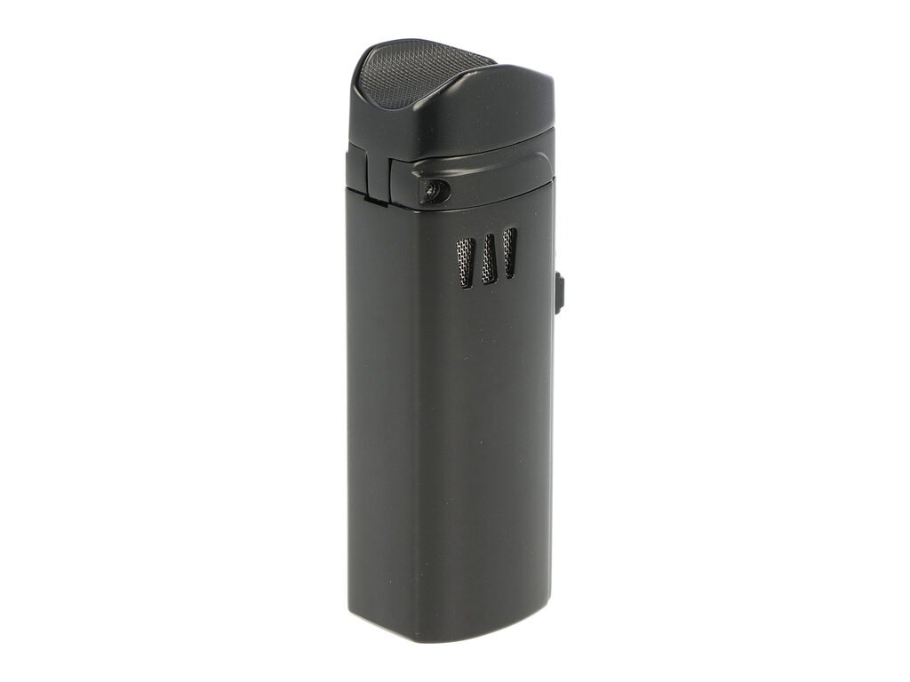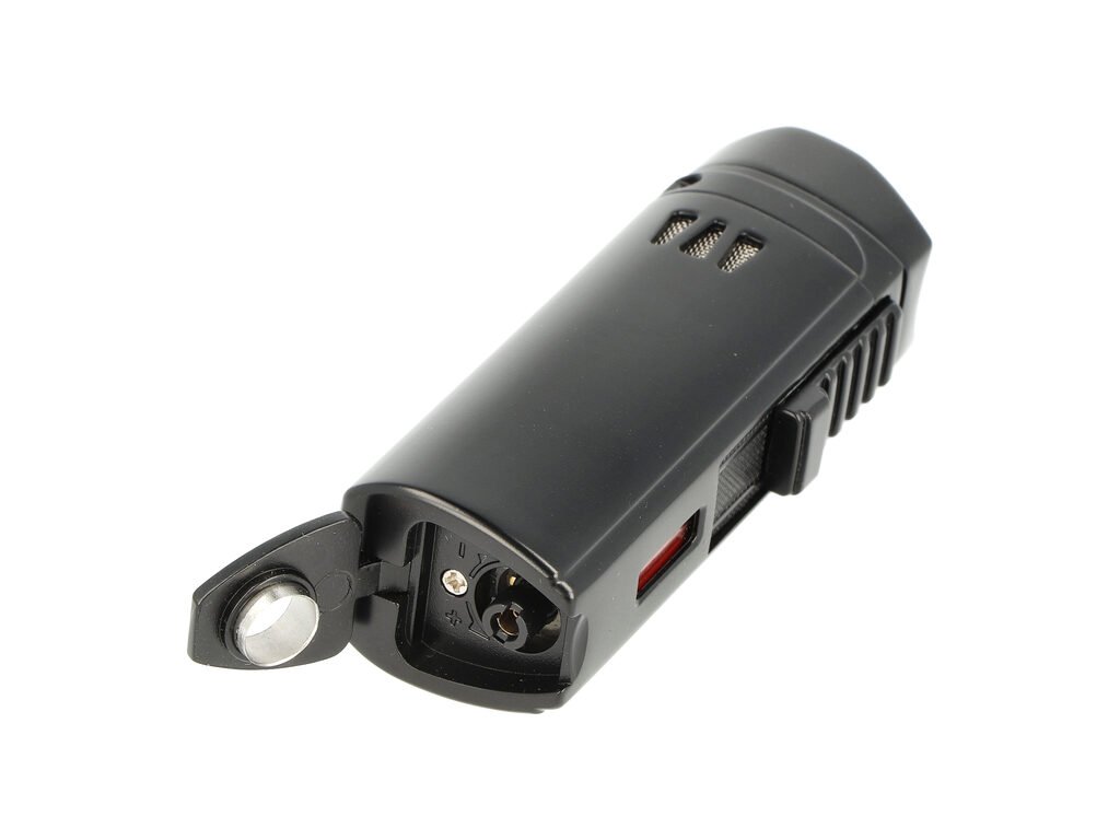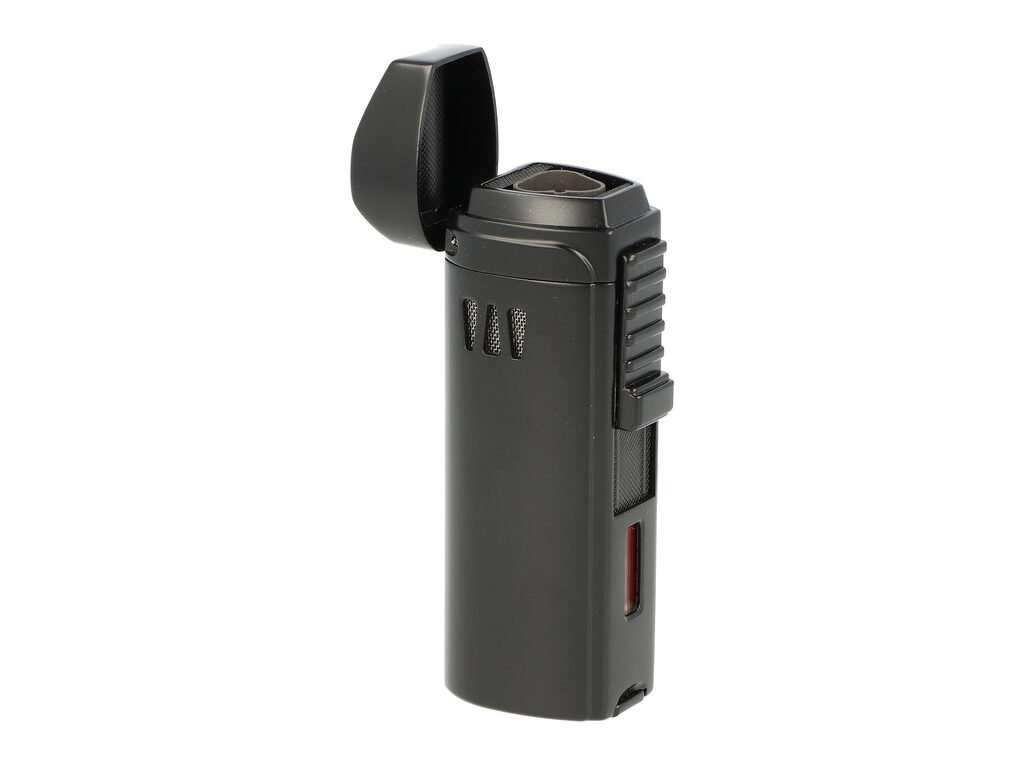 Po odklopení horní krytu a stisknutí bočního tlačítka směrem dolů dojde k zapálení třech trysek. Tyto trysky vyvinou silný plamen pro zapálení Vašeho oblíbeného doutníku. Doutníkový zapalovač je vybavený integrovaným vyštípávačem o průměru 8,5mm. Ve spodní části najdeme plynový plnící ventil a regulace intenzity plamene. Zapalovač je dodávaný v dárkové krabičce. Rozměry zapalovače 3,2x8,5x2,5 cm.