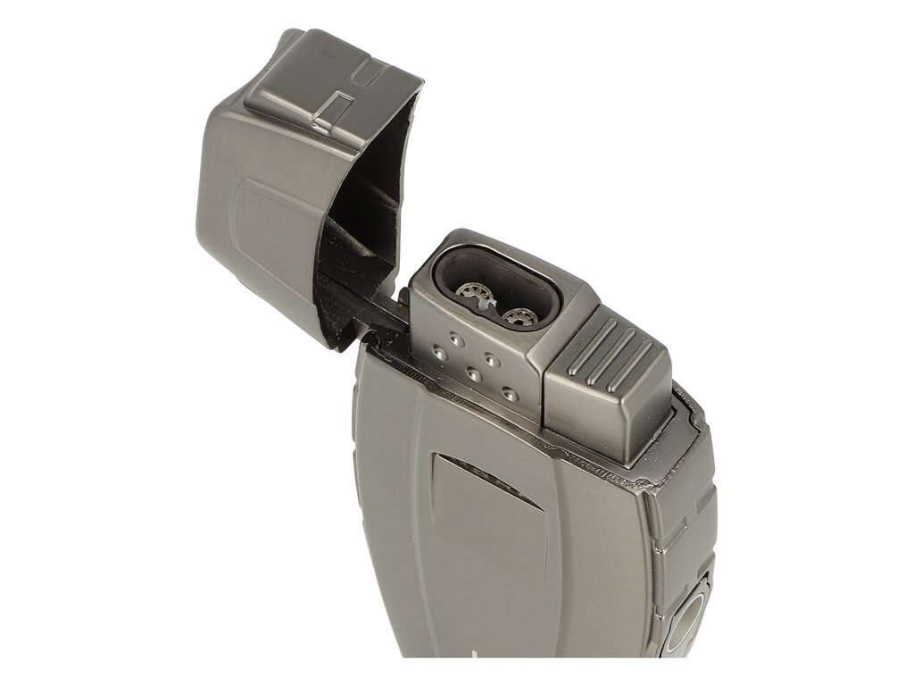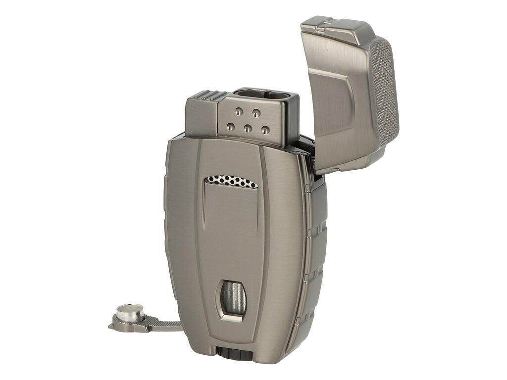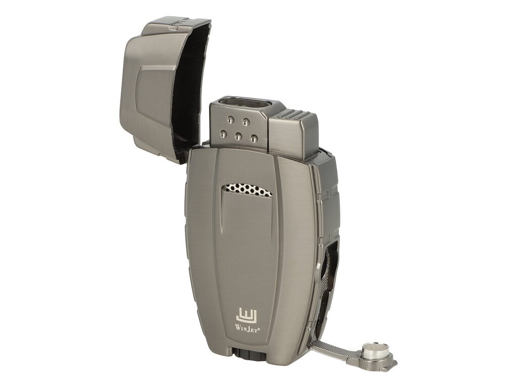 Zapalovač na doutníky Winjet Tornum Cigar s integrovaným vyštípávačem a dvěma tryskami. Kovový tryskový zapalovač má pololesklý povrch v gunmetalovém provedení. Po odklopení horního krytu a stisknutí tlačítka dojde k zapálení dvou trysek, které vyvinou silný plamen pro zapálení Vašeho doutníku. Díky průhlednému okénku můžeme kontrolovat hladinu plynu v zapalovači. Na boku zapalovače najdeme výklopný doutníkový vyštípávač. Prohlubně na krytu trysek lze využít jako stojánek na doutník. Ve spodní části je umístěna regulace plamene a plynový plnící ventil. Zapalovač je dodávaný v dárkové krabičce.