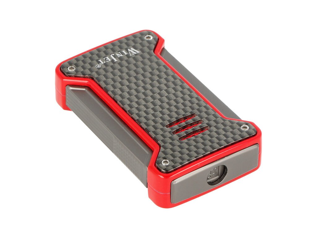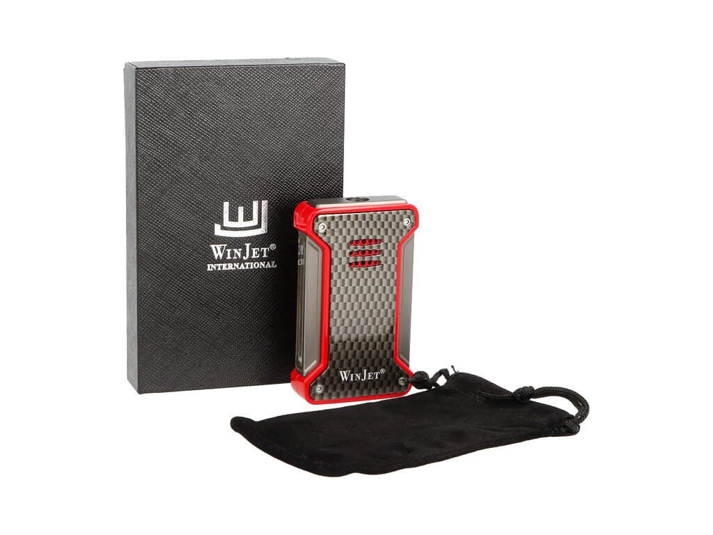 Tryskový zapalovač Winjet Torch Red/Grey. Kovový zapalovač v moderním designu v červeno šedé kombinaci a povrchem imitující karbon. Okénko se stupnicí umístěné na levé straně zapalovače umožňuje sledovat hladinu plynu v zapalovači. Stisknutím tlačítka na pravé straně dojde k odkrytí a současně zapálení jedné trysky, která vyvine dostatečně silný plamen pro zapálení cigarety nebo doutníku. Ve spodní části najdeme plnící ventile a nastavením intenzity plamene. Zapalovač je dodávaný v dárkové krabičce s látkovým stahovacím sáčkem.