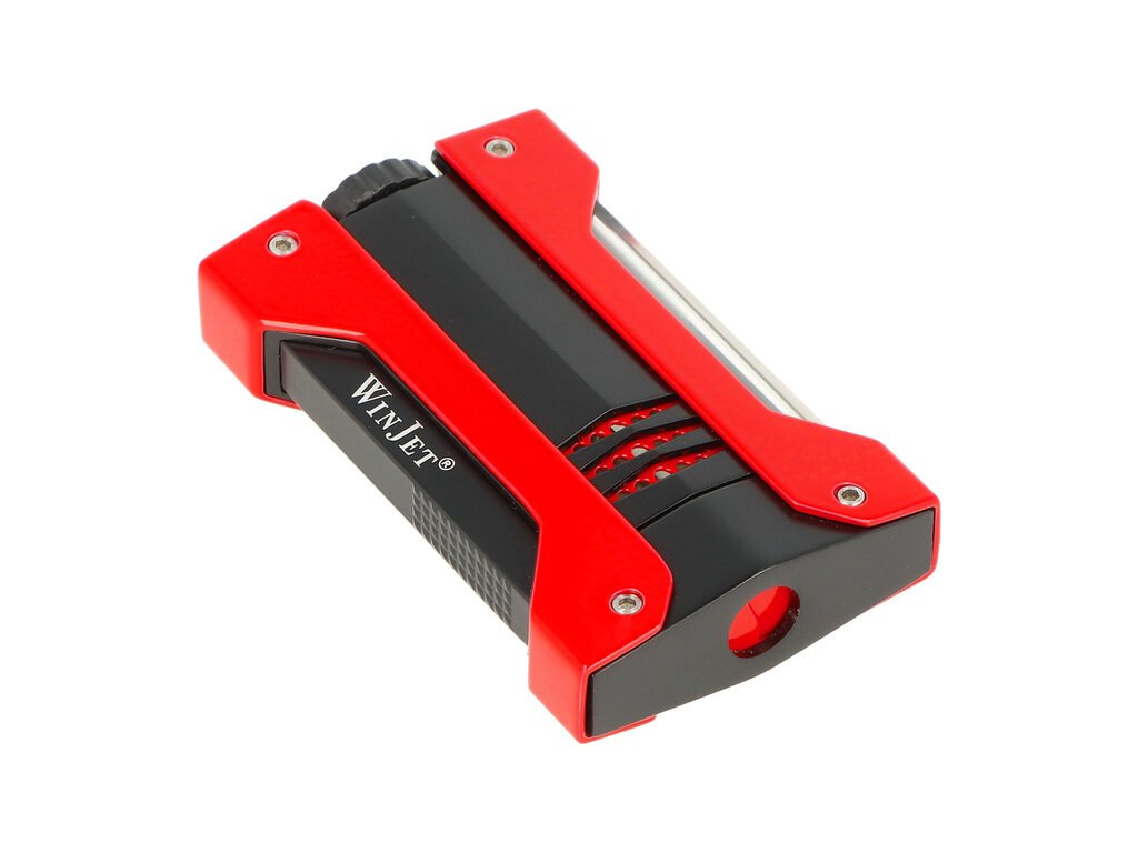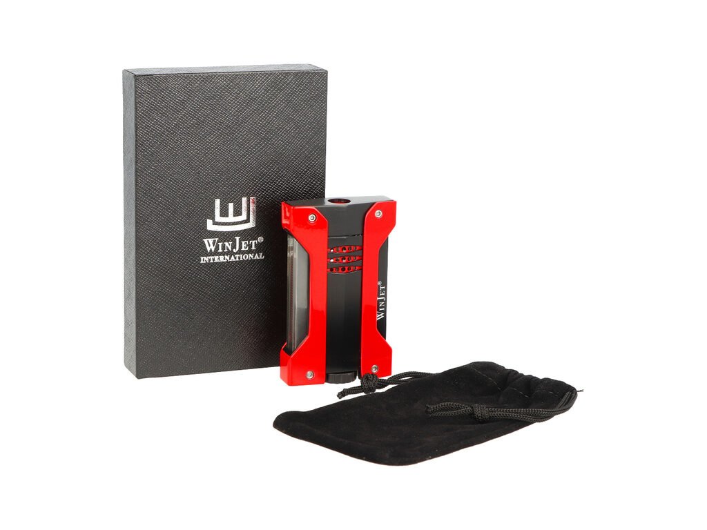 Tryskový zapalovač Winjet Torch Red. Kovový zapalovač v moderním designu je v červeno černé kombinaci. Okénko se stupnicí umístěné na levé straně zapalovače umožňuje sledovat hladinu plynu v zapalovači. Stisknutím tlačítka na pravé straně dojde k odkrytí a současně zapálení jedné trysky, která vyvine dostatečně silný plamen pro zapálení cigarety nebo doutníku. Ve spodní části najdeme plnící ventile a nastavením intenzity plamene. Zapalovač je dodávaný v dárkové krabičce s látkovým stahovacím sáčkem.