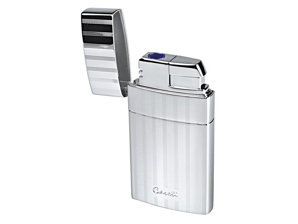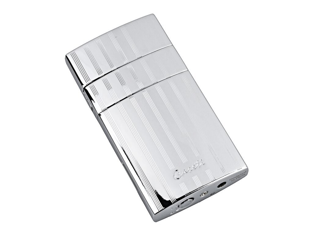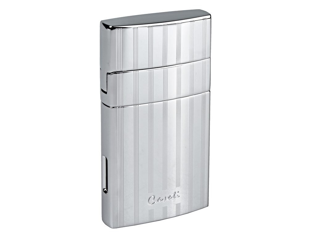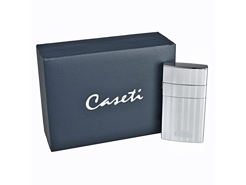 Elegantní tryskový zapalovač Caseti je kvalitně zpracovaný kovový turbo zapalovač, který má povrch v lesklém chromovém provedení a je zdobený jemnými gravírovanými proužky.